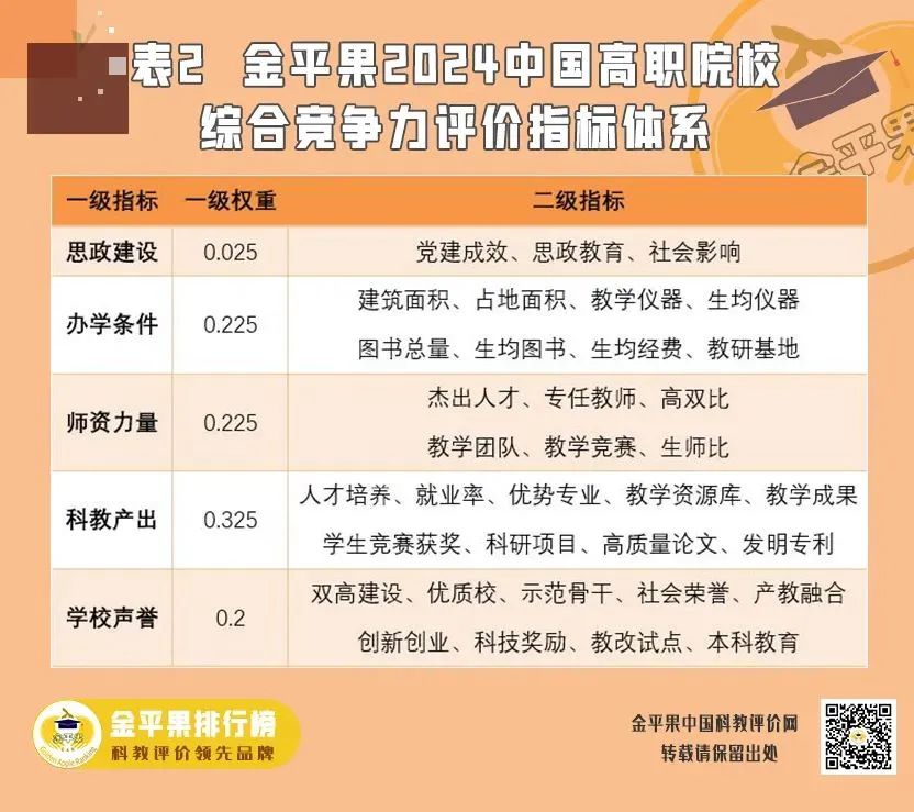 在2024年中国大学综合竞争力评价中,根据中共中央国务院关于《深化新时代教育评价改革总体方案》的要求,金平果围绕思政建设、办学条件、师资力量、科教产出、学校声誉,构建了“政治标准、业务标准、效益标准”三结合的教育评价体系,突出“双高”建设背景,坚持质量第一、效益优先和中国特色为重的评价标准,从学校、地区、类型、专业大类、专业类、专业和专业群等12个不同维度评价,对于参谋学校决策、引导招生与就业、促进校企合作等方面具有重要的意义。