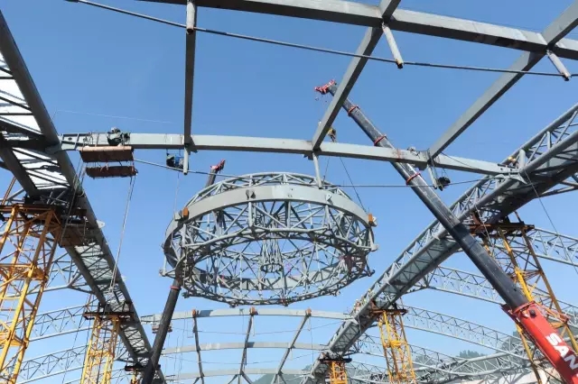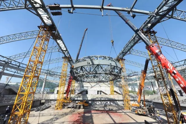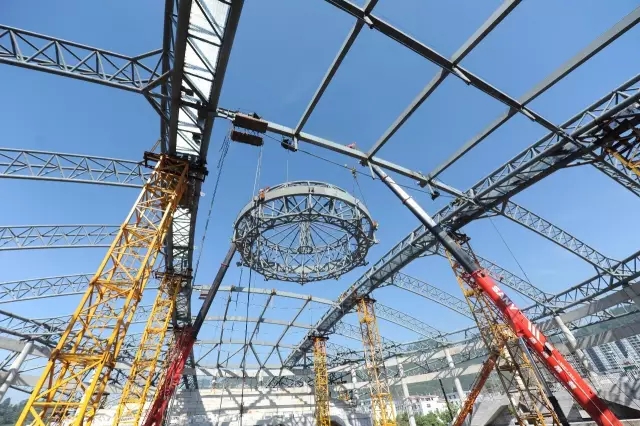 8月30日上午9时08分,随着苗鼓形状的外框钢架升至预定的位置,湘西州文化体育会展中心主要功能场馆之一的体育馆完成钢结构封顶。体育馆的封顶为下一步屋面施工打下基础,也为明年州庆前完成场馆建设提供了保障。