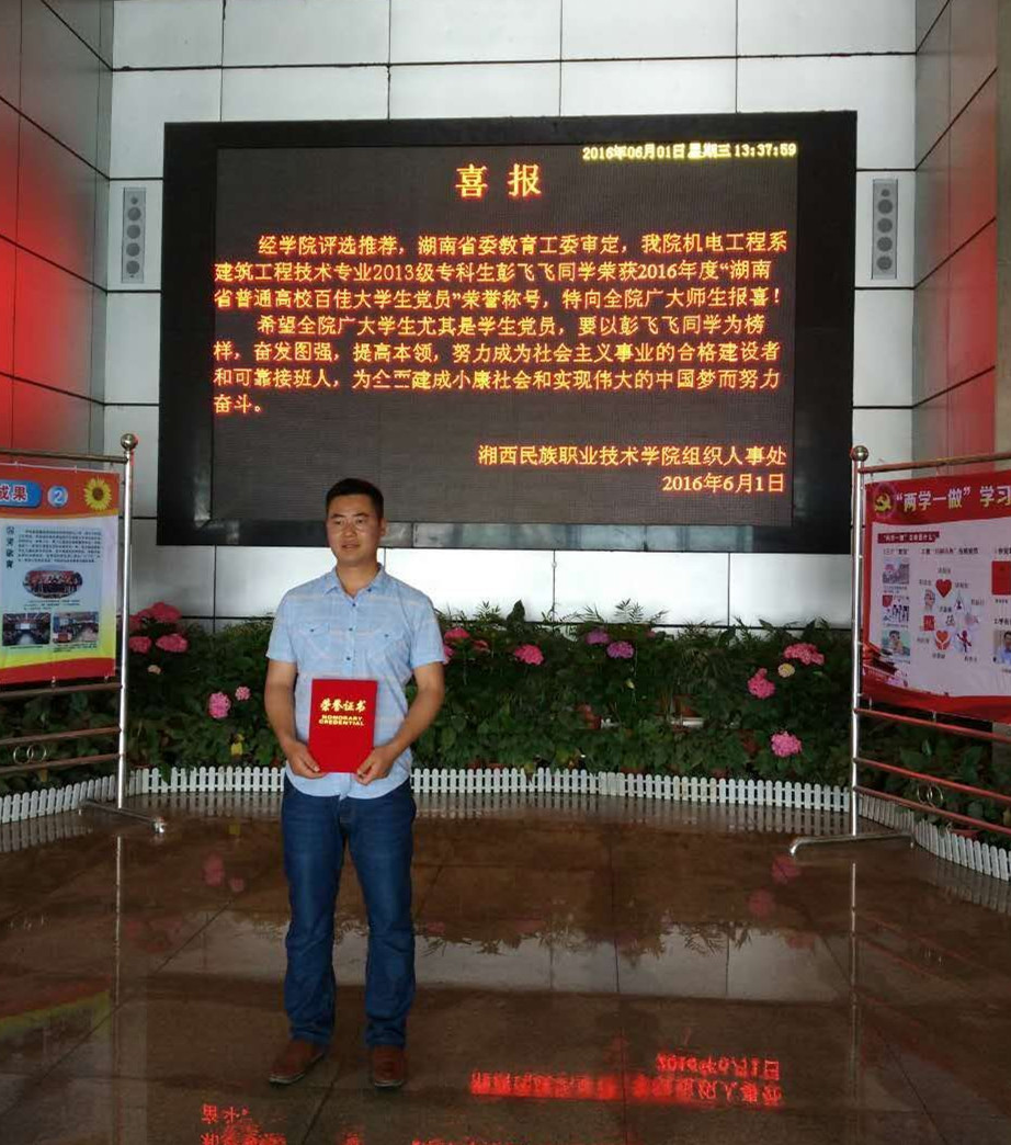 经学院评选推荐,湖南省委教育工委审定,我院机电工程系建筑工程技术专业2013级专科生彭飞飞同学荣获2016年度“湖南省普通高校百佳大学生党员”荣誉称号,特向全院广大师生报喜!