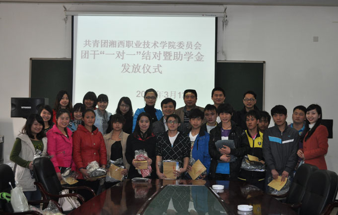 3月13日,湘西职院团委开展团干“一对一”结对关爱贫困学生暨助学金发放仪式。被关爱的学生从结对老师手中接过了400元助学金和一套崭新的衣服。