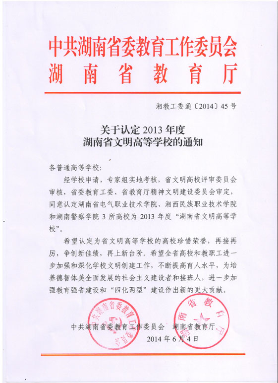 近日,中共湖南省委高等学校工作委员会、湖南省教育厅联合下发文件(湘教工委通【2014】45号),决定授予我院“湖南省文明高等学校”称号。这是学院近年来在荣获“州级文明单位”、 “湖南省教学工作优秀单位”、“湖南省大中专毕业生就业工作先进单位”、“湖南省德育工作先进单位”、“湖南省大中专学生‘三下乡’社会实践活动先进单位”、 “全国关心下一代工作先进单位”、“全国青年转移就业先进单位”之后的又一项重要荣誉。