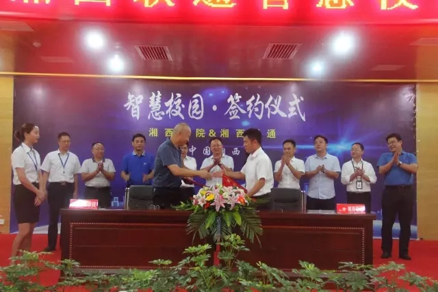 7月25日下午,湘西民族职业技术学院与中国联通湘西州分公司智慧校园签约仪式在湘西联通8楼会议室举行。中国联通湖南分公司副总经理陈小敏,集团客户事业部副总经理周健,湘西联通总经理何凌轩,副总经理郭友国、陈新,湘西民族职业技术学院党委副书记、院长彭延敏,院党委副书记、副院长宋清华,院党委委员、副院长姚斌,院党委委员曾翠林及相关人员出席签约仪式。
