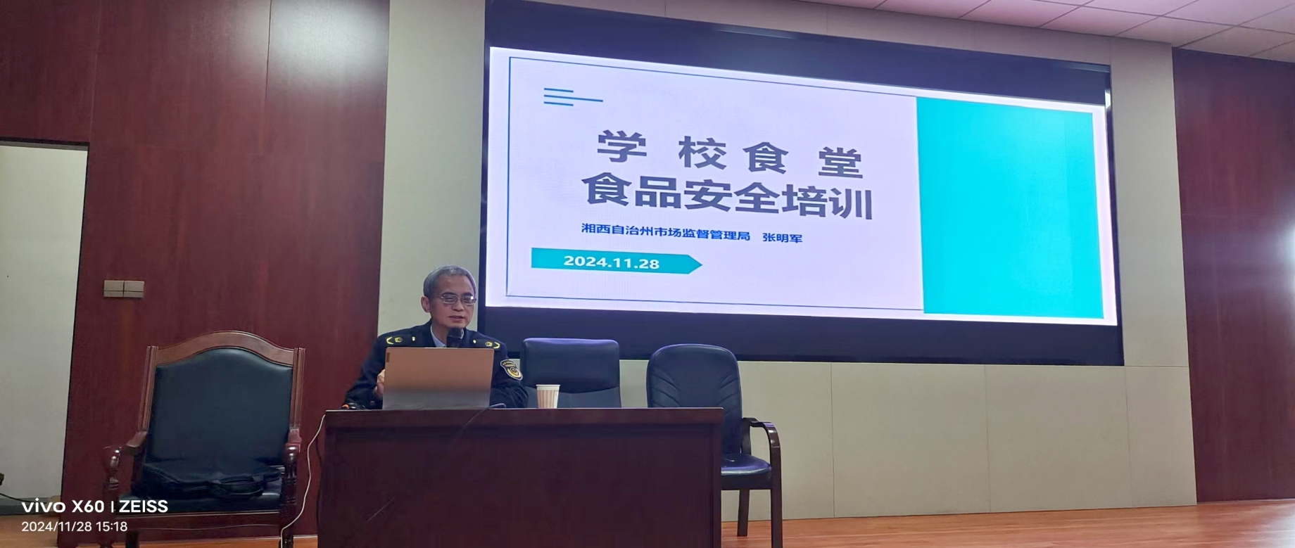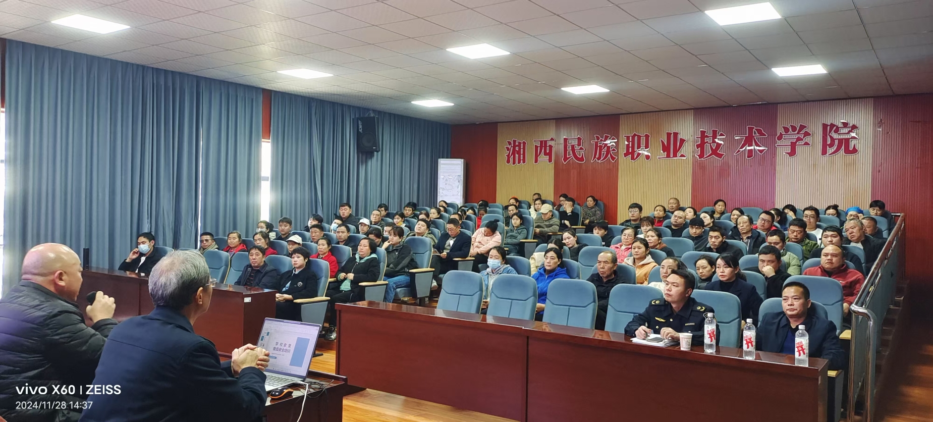 为进一步提升食堂食品安全管理水平,增强食堂从业人员的食品安全意识,扎实做好校园食品安全保障工作,2024年11月28日下午14:30,学校后勤管理处在图书馆二楼视频会议室举办2024年秋季食堂从业人员食品安全专题培训会。湘西州市场监督管理局食品经营安全监督管理科张明军科长培训讲座,后勤管理处分管膳食工作副处长樊雅俊主持会议,膳食科科长徐驰、分管食堂管理人员杨迎伟、田宏伟及学生食堂委托经营的餐饮公司驻场经理、食品安全员及餐饮班组负责人共计90余人参加此次培训。
