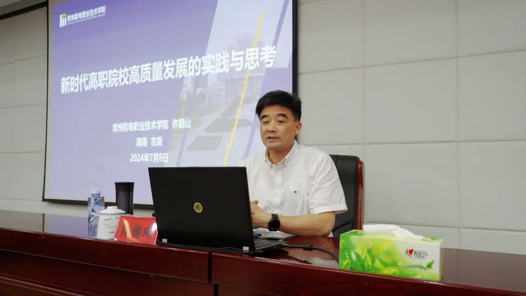 签约仪式结束后,许朝山作了“高职院校高质量发展的实践与思考”和“打造人工智能与先进制造现代产业学院 推进产教科深度融合”2个专题讲座。许朝山立足职业教育服务国家发展战略,深刻分析了当前国际国内形势,介绍了常州机电职院在推进职业教育高质量发展中的创新实践和丰硕成果,对推进新“双高”建设提出了深入思考,并聚焦产教科深度融合,分享了常州机电职院在现代产业学院建设上的经验做法,为我校推进“双高”建设和现代产业学院建设,加快脱贫地区职业教育高质量发展提供了有益的启示和借鉴。