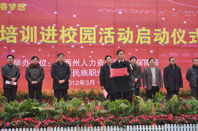 “点燃创业激情,放飞青春梦想”, 3月 1日 上午,由州人力资源和社会保障局、湘西职业技术学院联合举办的湘西“2012年创业培训进校园活动”启动仪式在我院文化广场举行。学院党委副书记、院长李光寒,州人力资源和社会保障局局长龙春生出席启动仪式并讲话。学院党委副书记曹义文、副院长宋清华、副院长杨建平出席了启动仪式。09级高职电算会计2班学生杨冉冉做大学生代表发言。州人民政府副巡视员胡万凤同志出席启动仪式,并宣布“2012年创业培训进校园”活动启动。学院700余名学生参加了启动仪式。