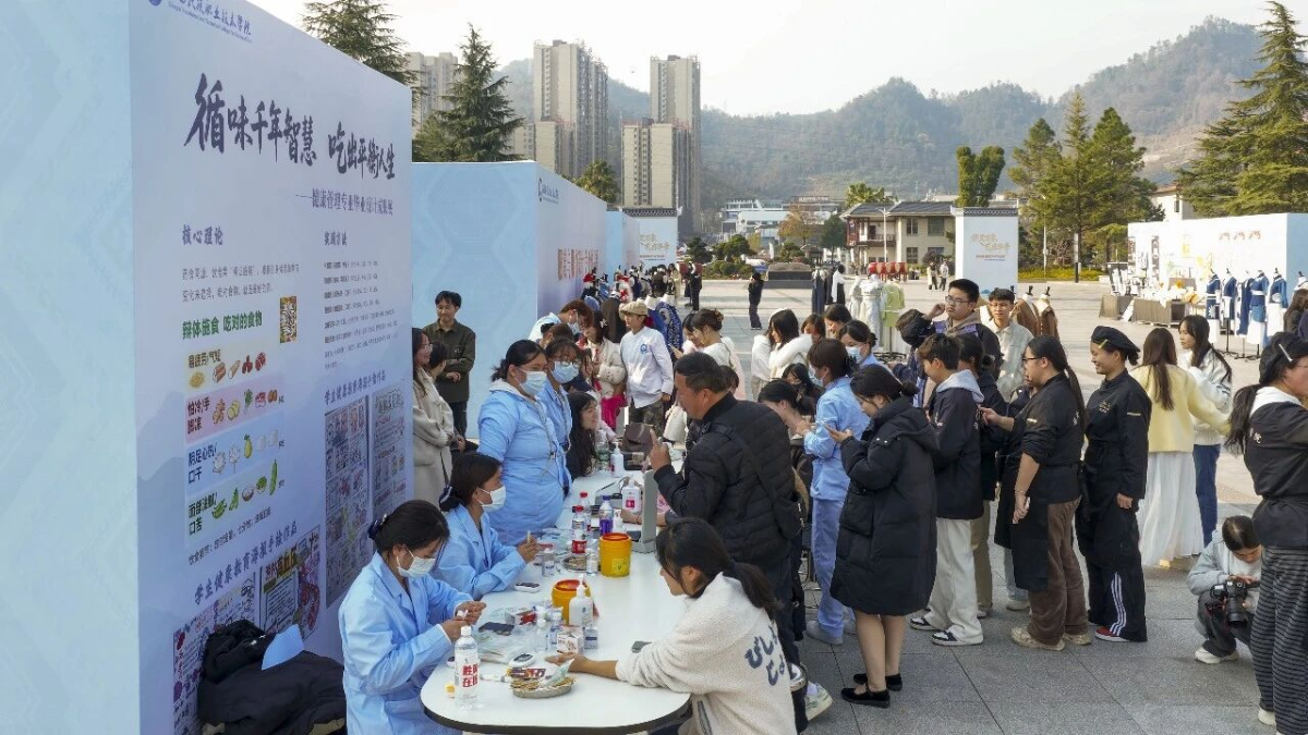 本次毕业展以专业为单元,各具特色。旅游管理专业围绕“湘西风情,专业呈现”主题,通过沉浸式表演、精品旅游路线策划、茶艺展示等形式,全方位解读湘西旅游的文化内涵与服务品质。健康管理专业通过血压测量、餐后血糖检测、中医康复按摩等互动体验,突显健康管理在旅游与日常生活中的实用价值。烹饪工艺与营养专业推出六桌主题宴席,巧妙融合湘西非遗、自然意象与清廉文化,赋予菜品深厚的文化韵味与创新表达。中西面点工艺专业则打造四组主题展台,将民族纹样、自然美学与面点技艺相融合,展现中西交汇的匠心之作。