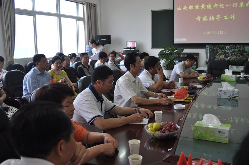 6月24日,汕头职院28名部门负责人在党委书记黄陵的带领下来我院参观交流。冒着大雨,汕头职院一行乘坐大巴兴致勃勃地参观了我院新校区。在我院党委书记吴正有、院长李光寒、副院长刘辉的陪同下,汕头职院黄书记撑着伞登上高处,观看了学院全景。对我院融现代设计、民族特色、自然风光于一体的校园景观,参观人员赞叹不已,纷纷表示令人意外又惊喜。