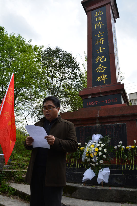 初春的健身坡上松枝翠绿,“抗日将士阵亡纪念碑”几个鎏金大字在阳光下格外引人瞩目。在纪念碑前,参加这次活动的老师和学生代表手拿黄花,整齐列队,神情肃穆,向在抗日战争中牺牲的英烈们敬献花圈,鞠躬默哀。系学生科长彭凯宣读了祭文,随后,全体人员向抗日阵亡将士纪念碑敬献鲜花,并绕纪念碑一圈。
