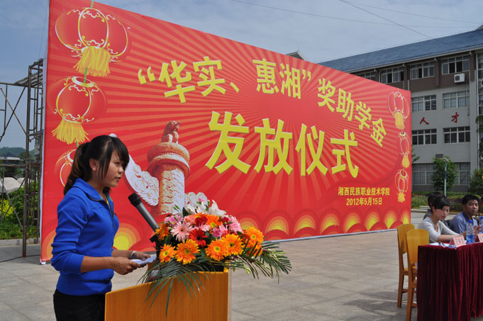 5月15日下午,湘西职院在学院文化广场前举行了“华实奖学金”、“惠湘奖助学金”发放仪式。学院党委书记吴正有,党委副书记、院长李光寒教授,副院长杨建平及各系部负责人出席仪式。州教育局学生资助中心主任李刚出席仪式并讲话。仪式由学生处处长单新德主持。